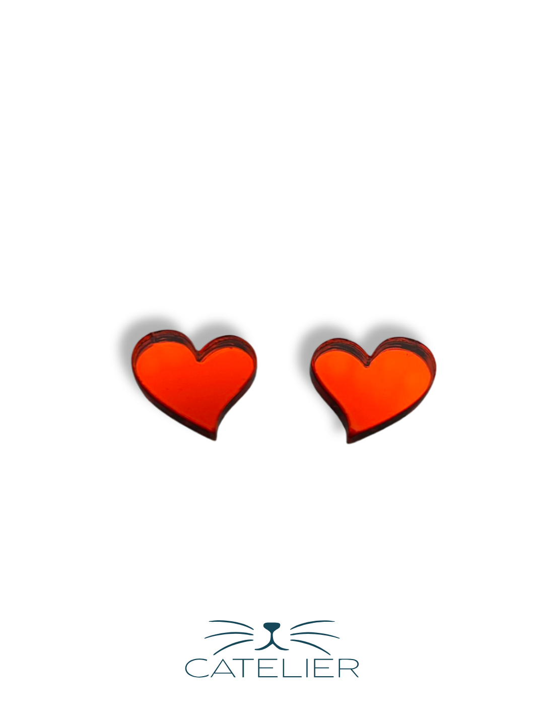 Un mini pendiente de corazón asimétrico en rojo espejo, con perno. Pequeño, ligero y lleno de personalidad.