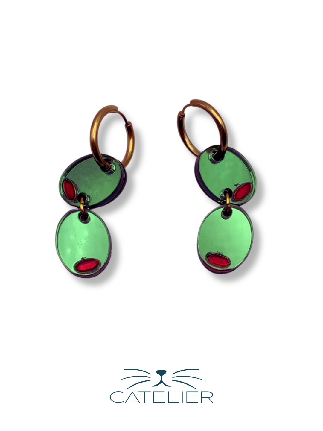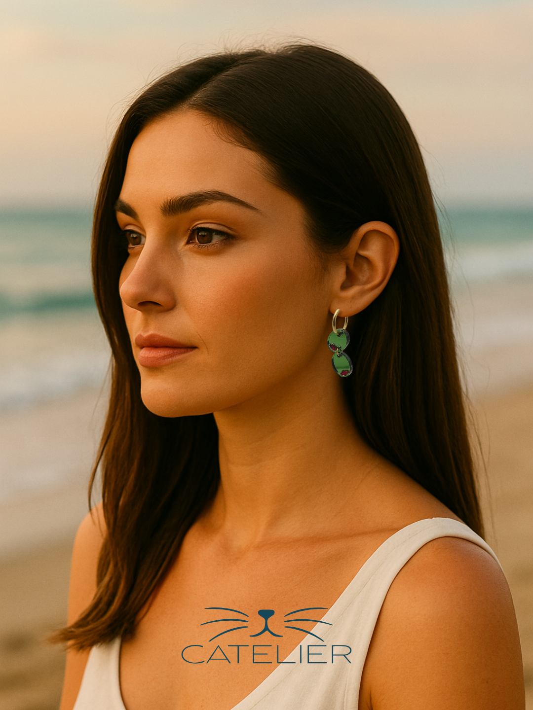 Los Pendientes Doble Aceituna son un homenaje divertido y original a uno de los iconos más reconocibles de nuestra gastronomía. Con un diseño de dos aceitunas colgando en cascada, fabricadas en metacrilato verde oliva espejo y con un pequeño corazón de pimiento rojo en el centro, aportan un toque fresco y mediterráneo a cualquier look.