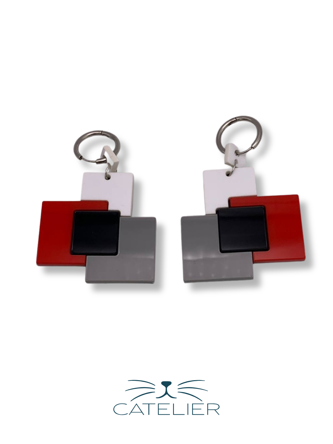 Pendientes Bauhaus, con bloques geométricos en rojo, gris, blanco y negro. Modernos, minimalistas y llenos de estilo.