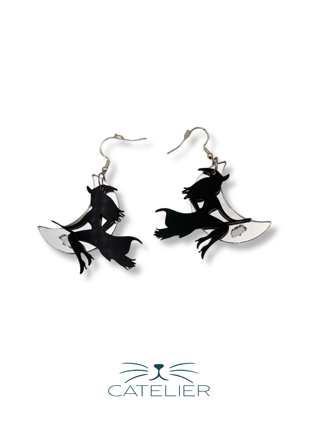 Los pendientes Bruja en la Luna son un clásico imprescindible de Halloween. Elaborados en metacrilato negro liso, muestran la silueta de una bruja volando en su escoba, acompañada de una brillante luna en espejo plateado que refleja la luz y aporta un toque elegante al diseño. Su forma llamativa y ligera los convierte en un accesorio cómodo y muy especial.