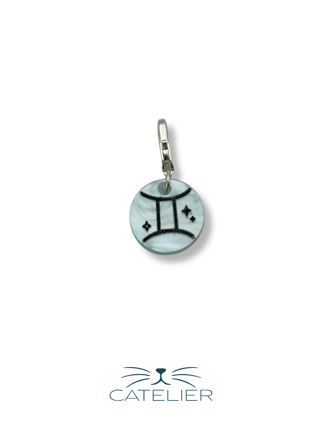 El charm Géminis representa la dualidad, la curiosidad y la creatividad. Fabricado en metacrilato, con forma redonda de 1,5 cm, lleva el símbolo de Géminis grabado con precisión.