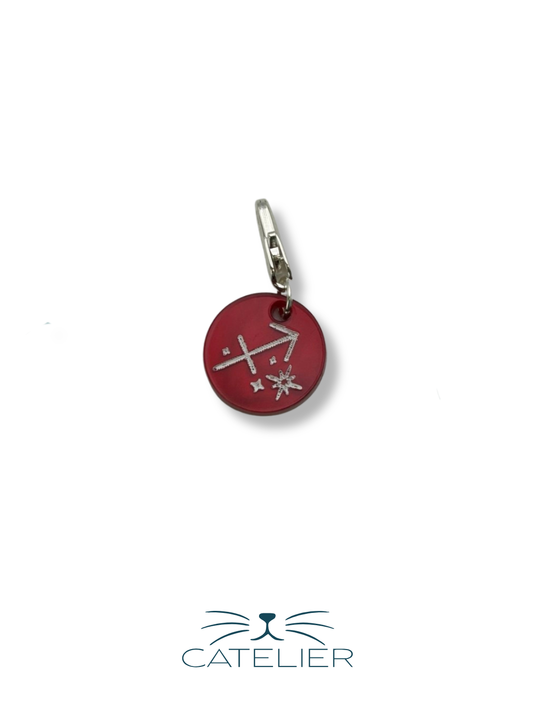 El charm Sagitario representa la libertad, el viaje y el optimismo. Fabricado en metacrilato, con diseño redondo de 1,5 cm, incluye el símbolo de Sagitario grabado.