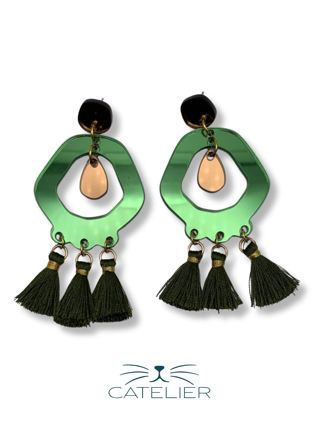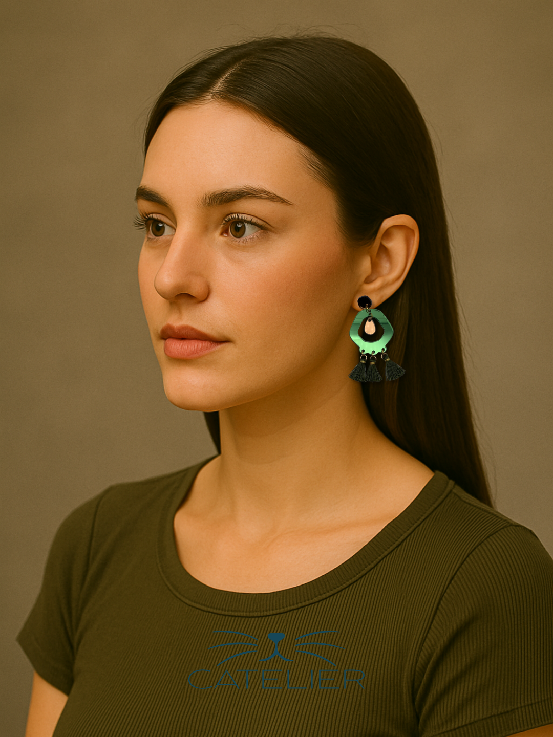 Los pendientes Esmeralda son un diseño vibrante y sofisticado. Están elaborados íntegramente en metacrilato espejo, con una estructura en verde intenso y un detalle central en tono beige que resalta por su brillo. El conjunto se completa con tres borlas verde oscuro, que aportan movimiento y un aire natural inspirado en la elegancia de las gemas.