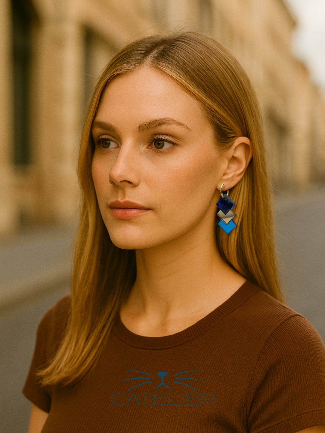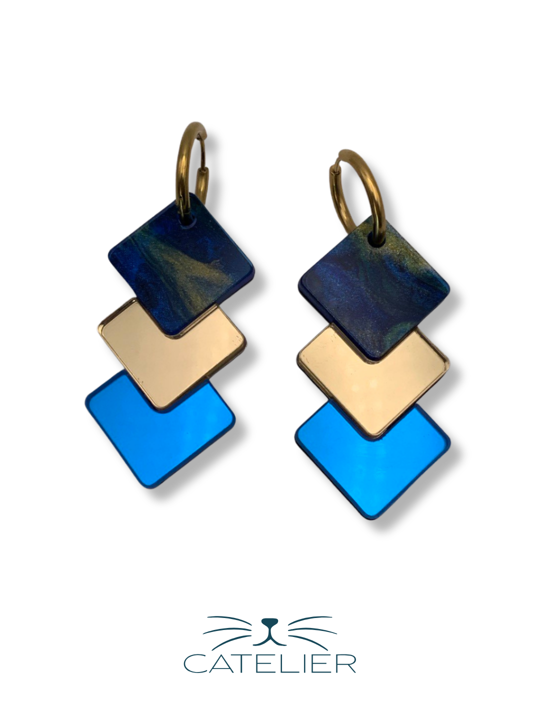 Los pendientes Galaxia son un viaje al universo en forma de accesorio. Su diseño está compuesto por tres piezas geométricas superpuestas: una en metacrilato dorado espejo, otra en azul espejo, y una tercera con un acabado único de efecto nebulosa en tonos azul y dorado, que aporta un brillo mágico y lleno de misterio.
