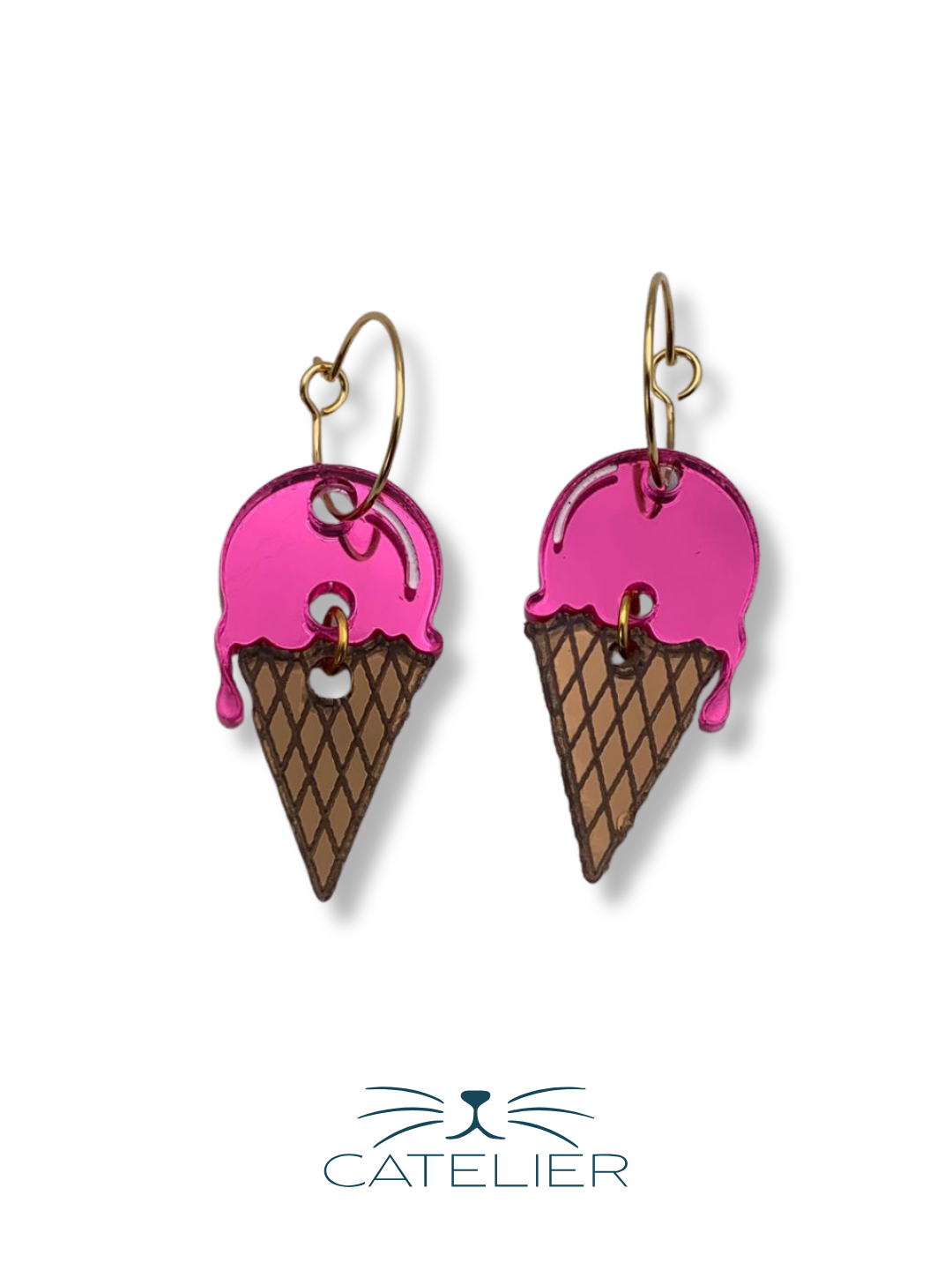 Pendientes Ice Cream, con cucurucho en marrón y bola rosa espejo. Dulces, frescos y llenos de alegría.