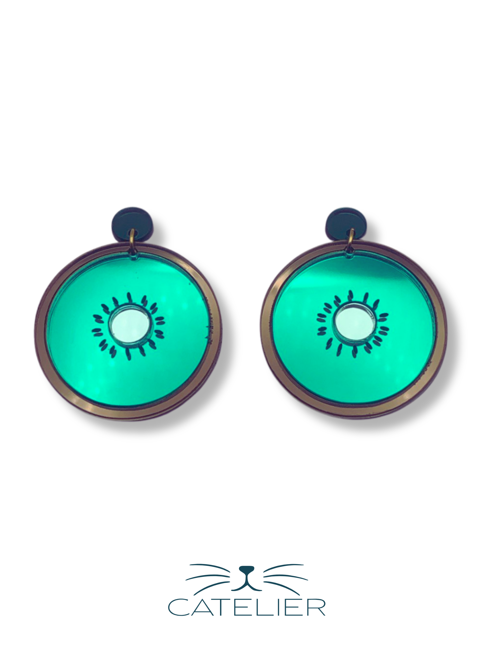 El pendiente Kiwi está inspirado en la fruta que conquista por su color y textura. Fabricado a mano en metacrilato, combina tonos de  2 tonos de verde espejo, cobre espejo y detalles en negro para representar la pulpa, las semillas y el característico centro claro del kiwi.