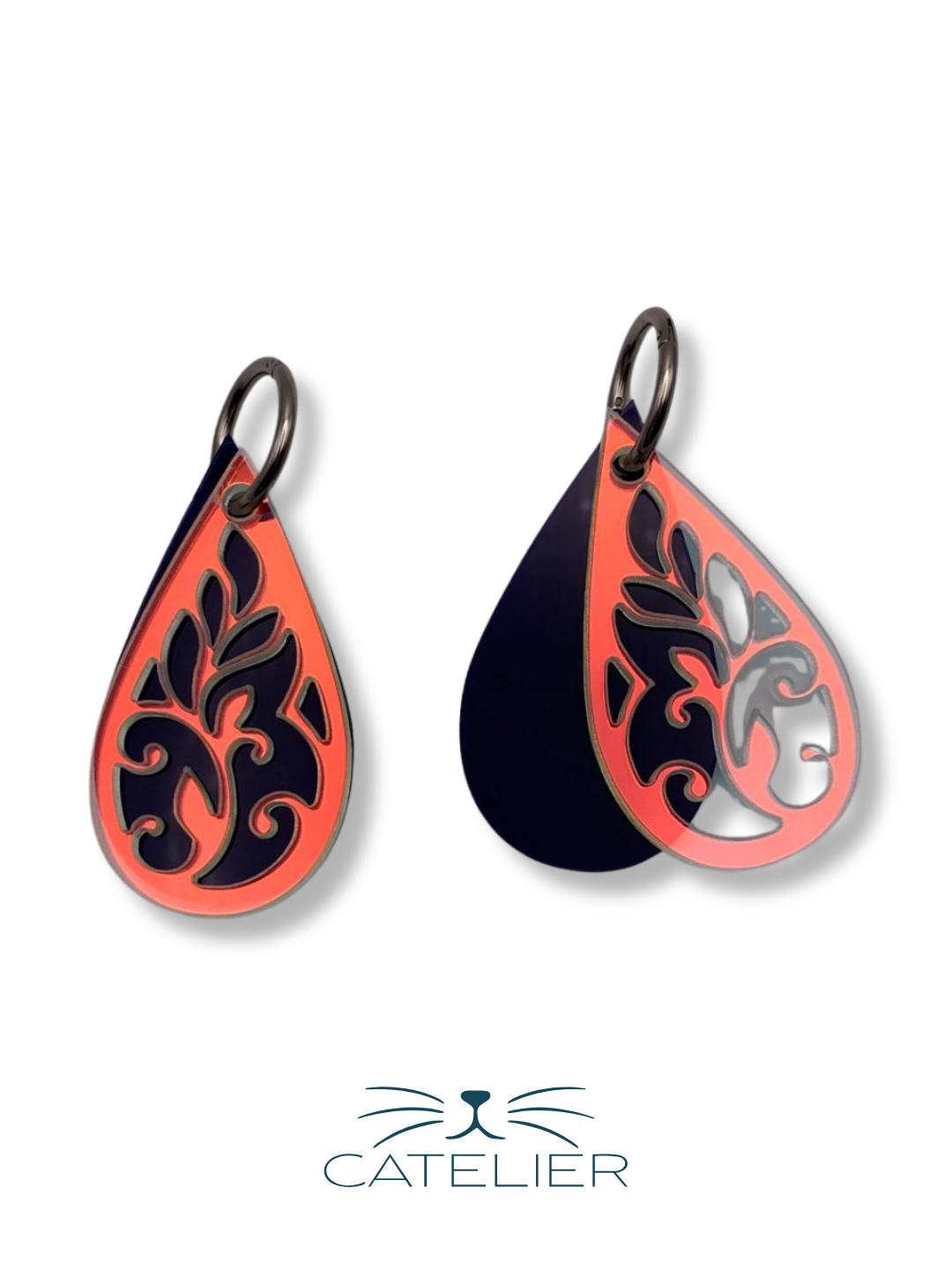 Los pendientes Lágrima Mística son un diseño lleno de magia y sofisticación. Su parte delantera está realizada en metacrilato iridiscente con un grabado floral que refleja la luz creando destellos únicos, mientras que la parte trasera en negro liso aporta contraste, sobriedad y un acabado muy elegante.
