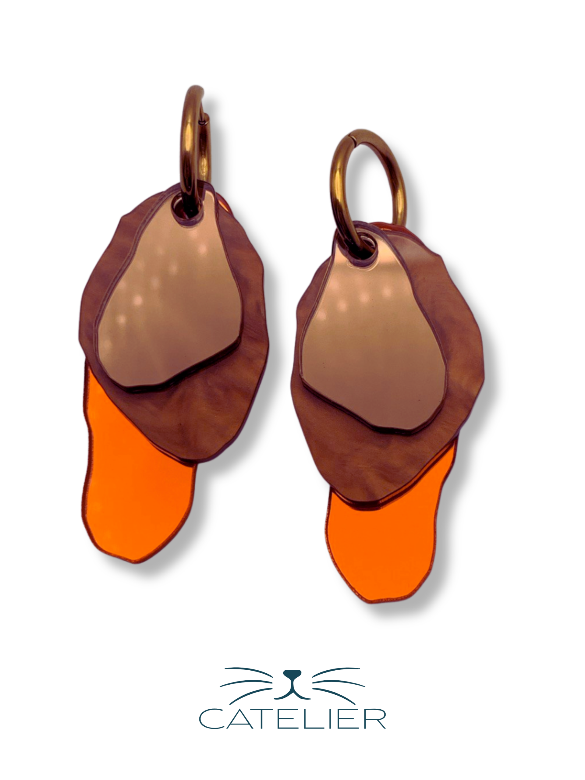 Los Pendientes Láminas de Piedra están inspirados en la belleza imperfecta y orgánica de las piedras naturales. Su diseño se compone de tres piezas abstractas de metacrilato, sueltas y superpuestas, que se mueven libremente al llevarlos.