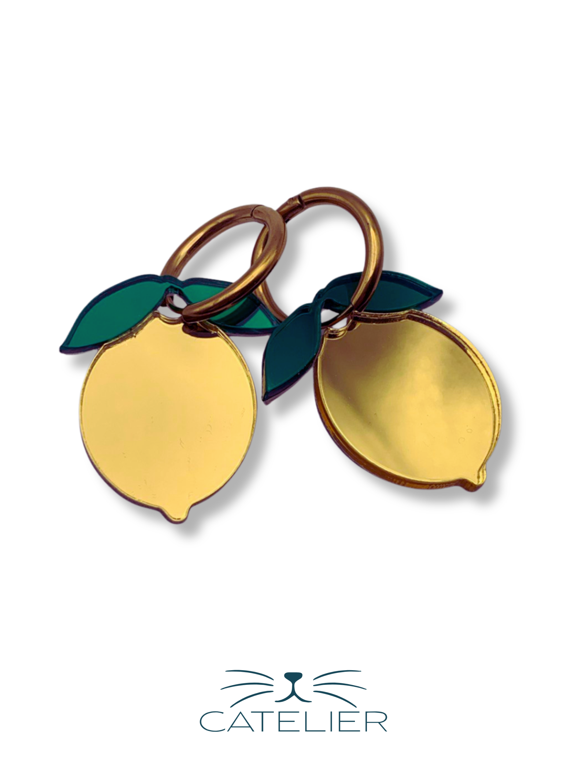 Pendientes en forma de limón hechos en metacrilato amarillo espejo, con hoja verde brillante. Frescos, llamativos y hechos a mano en España.