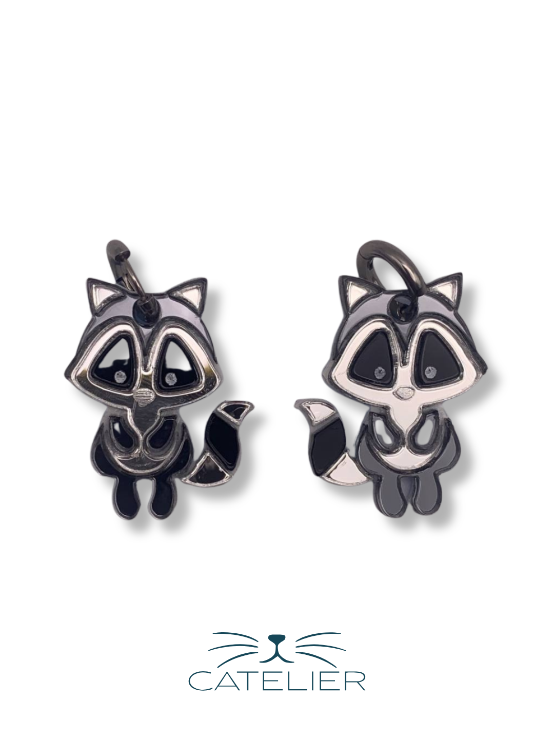 El pendiente Mapache combina metacrilato espejo en tonos gris, negro y blanco, mostrando el inconfundible antifaz de este simpático animal. Su diseño detallado y tierno lo convierte en un accesorio único y divertido.