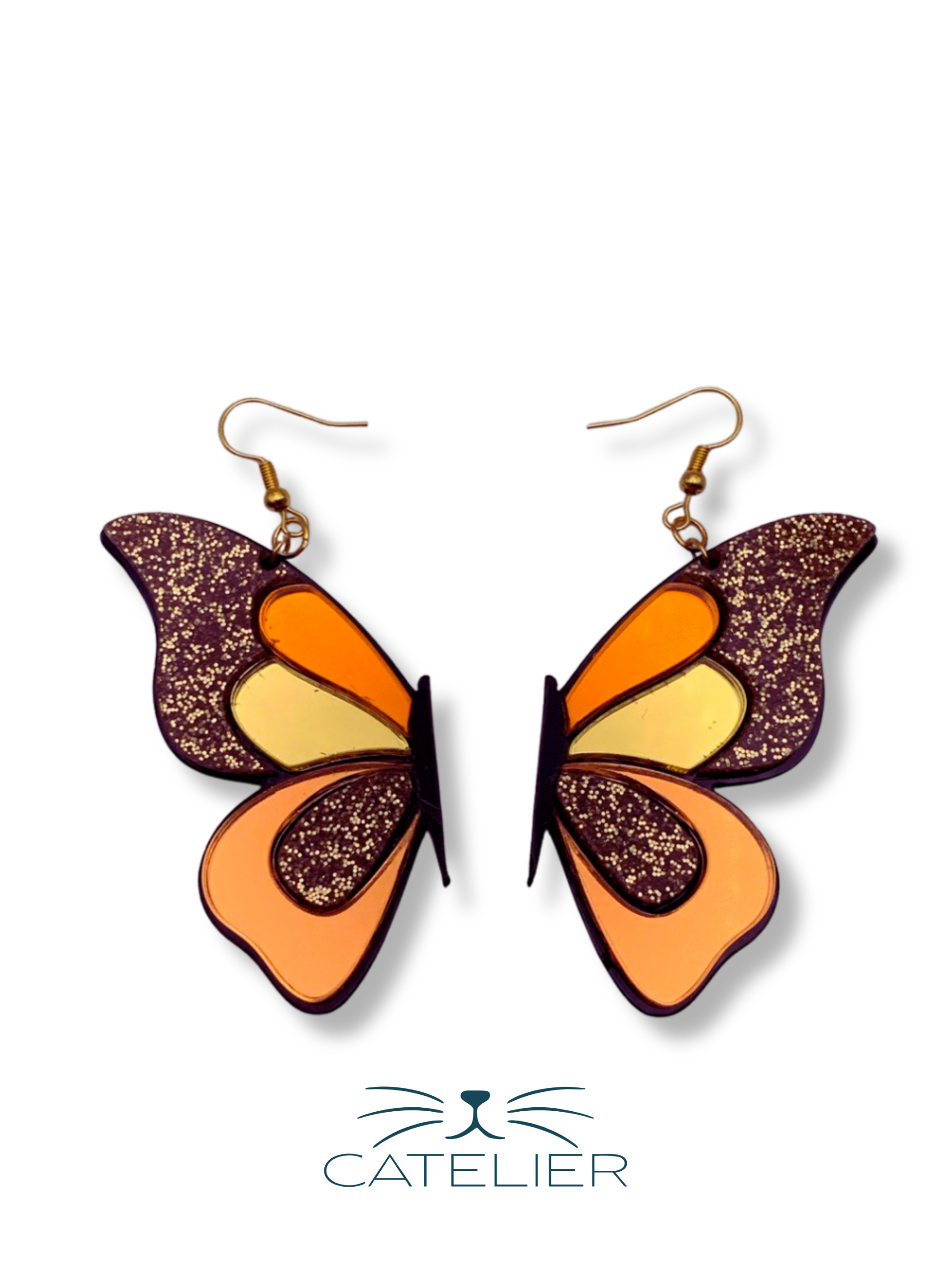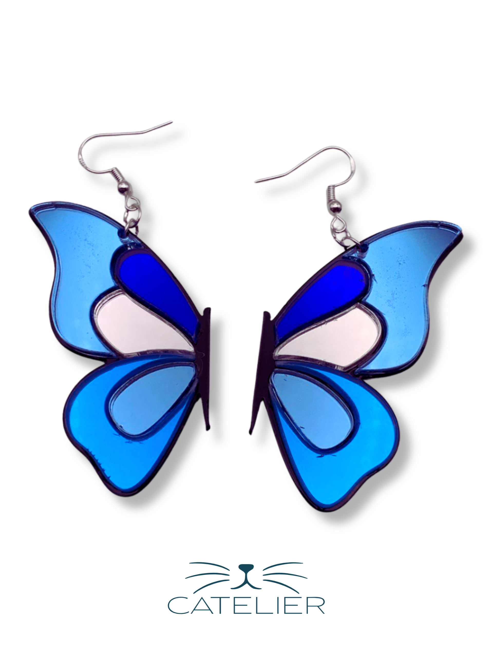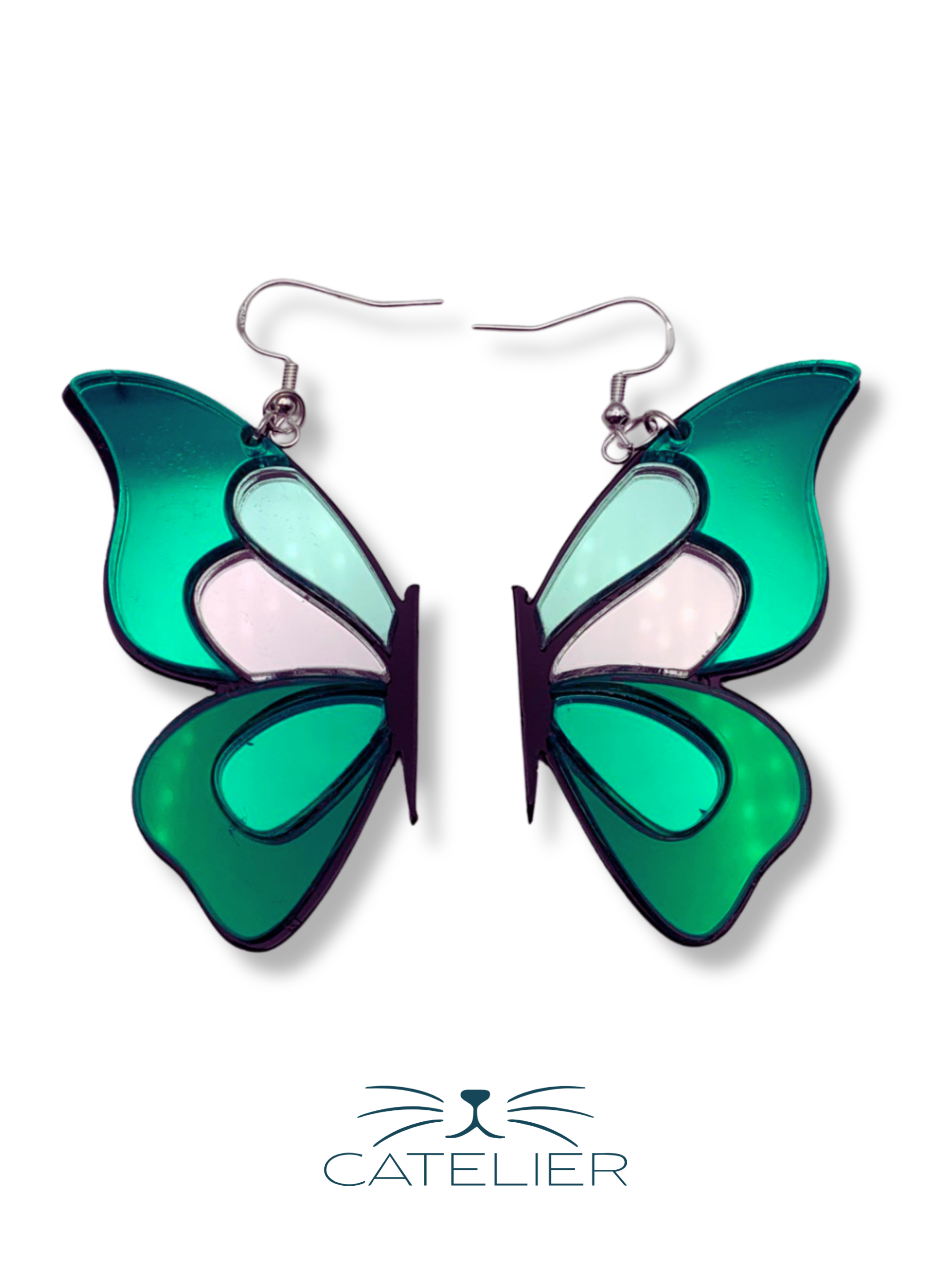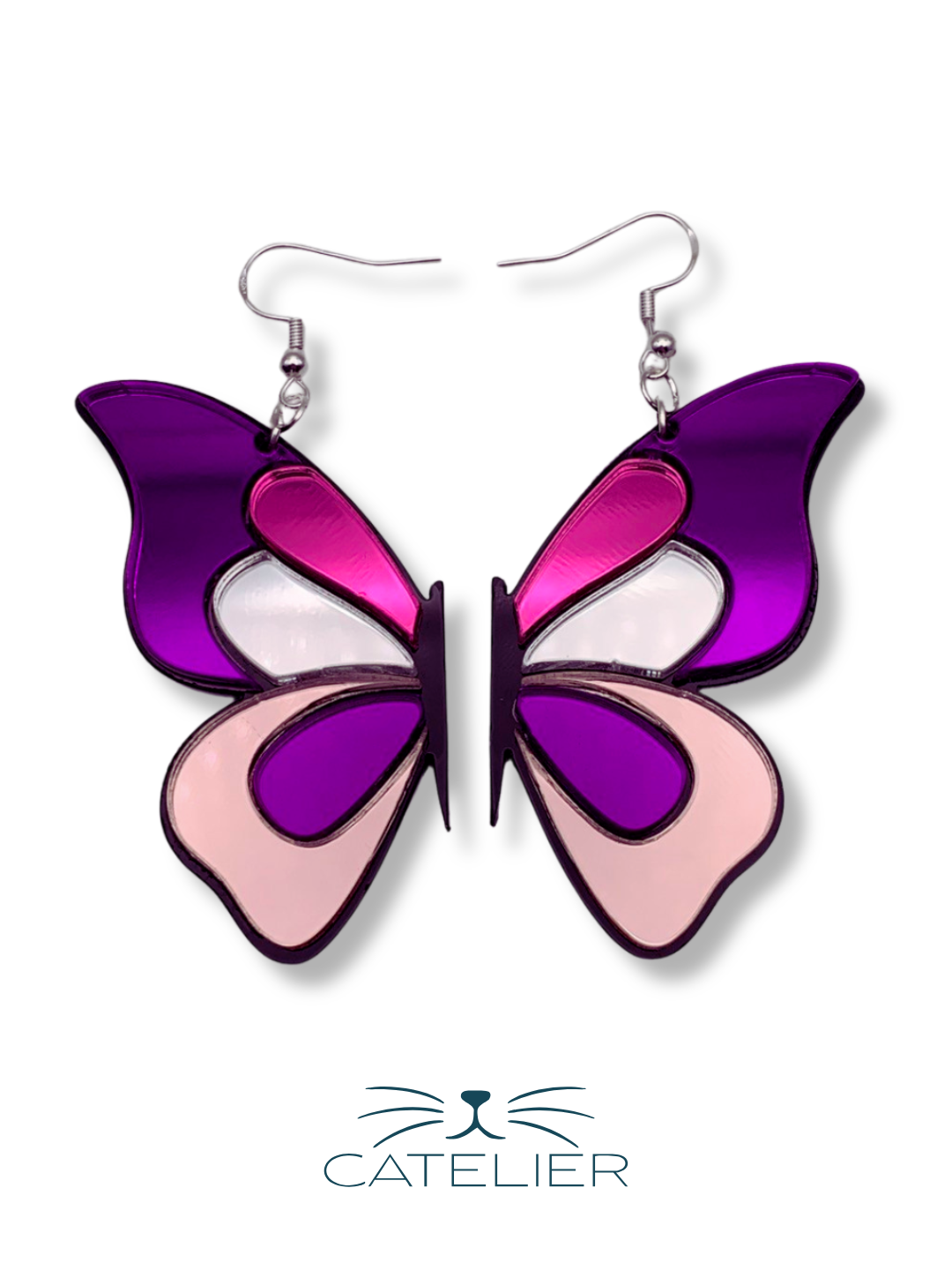 Pendientes asimétricos de media mariposa, en metacrilato espejo plateado, rosa y rosa oro. Diseño único y sofisticado, hecho a mano en España.