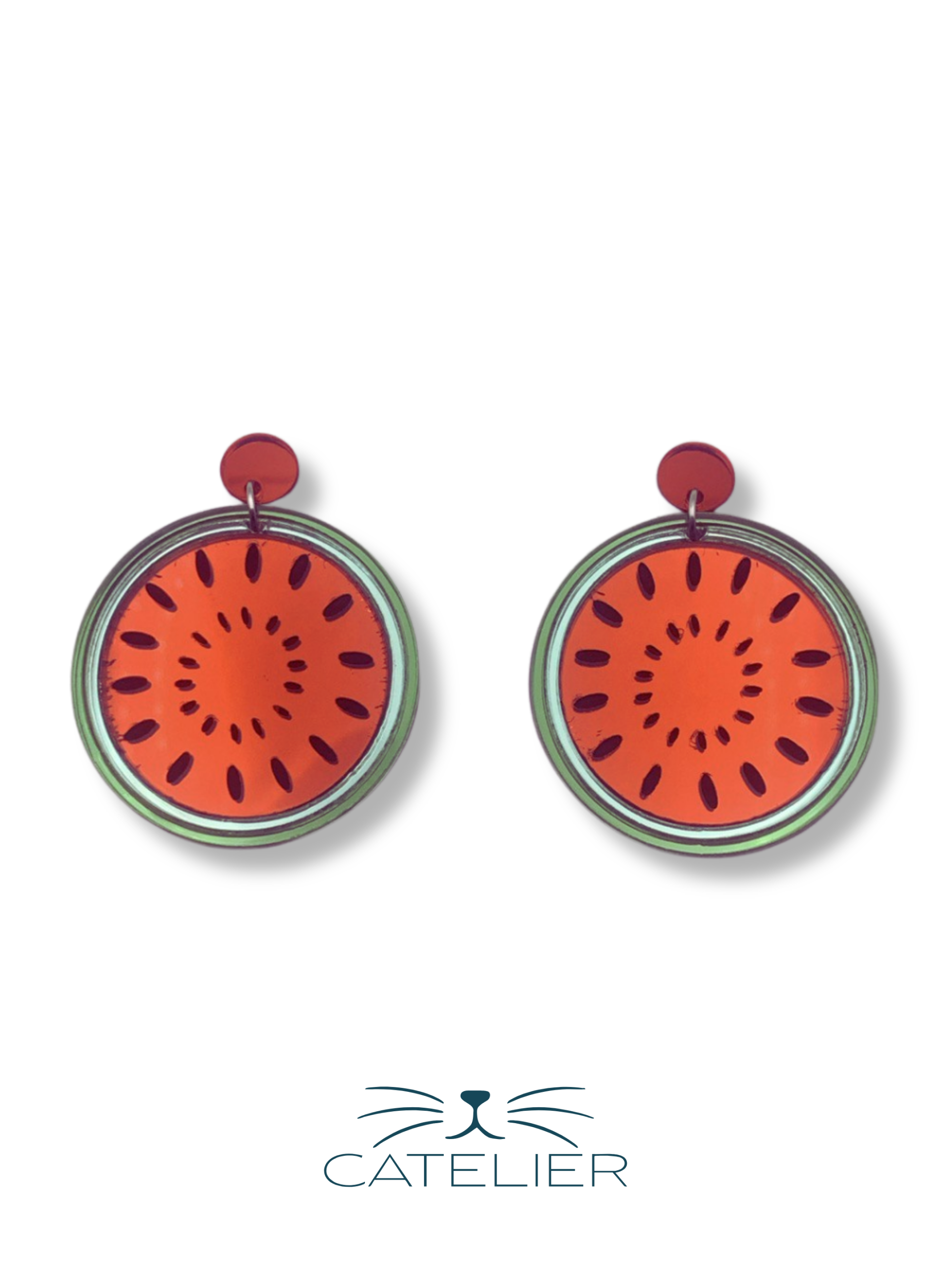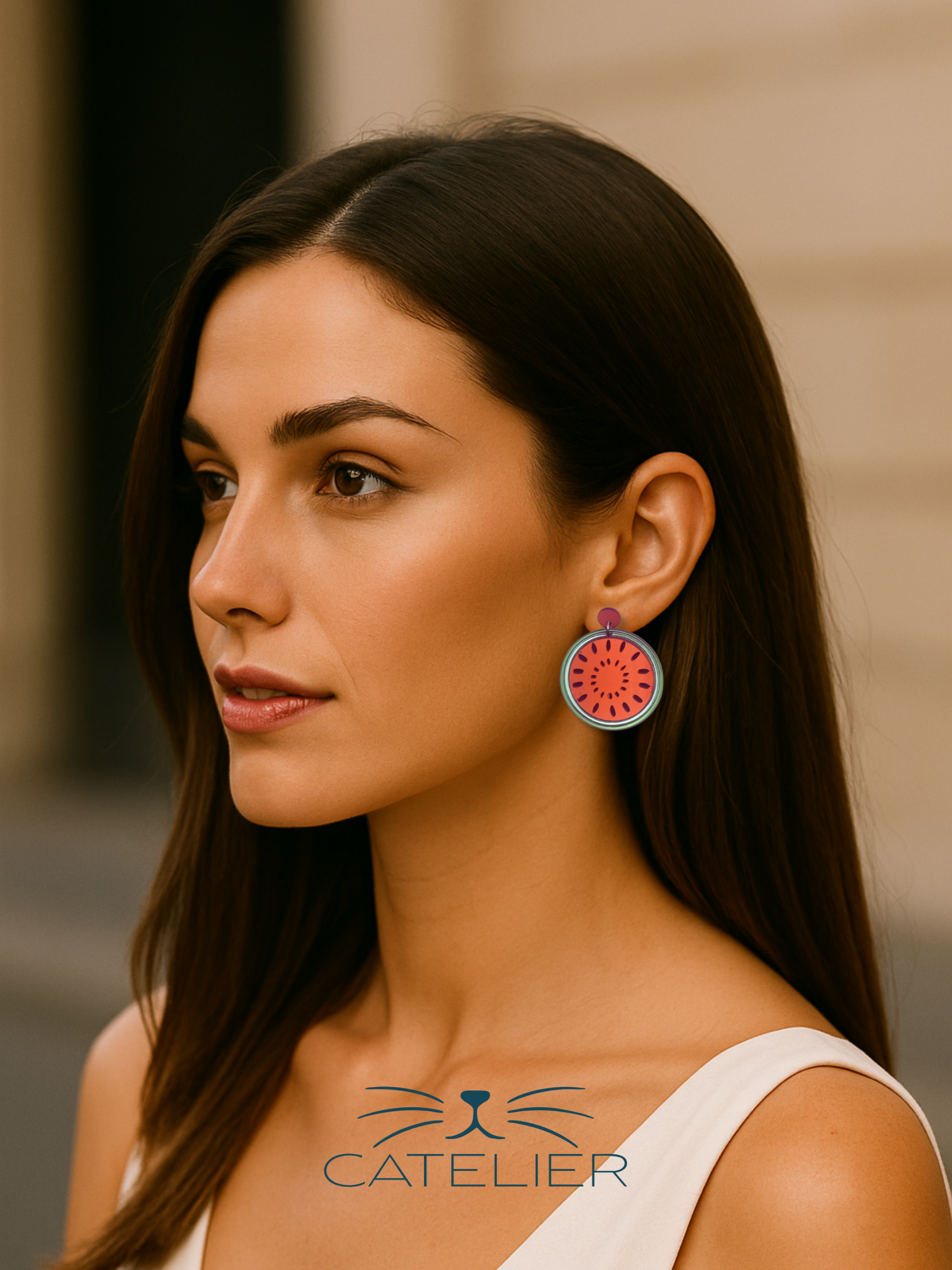 Los Pendientes Rodaja de Sandía son un refrescante toque de verano. Fabricados en metacrilato rojo y verde espejo, con semillas grabadas, capturan la esencia vibrante y jugosa de esta fruta icónica.