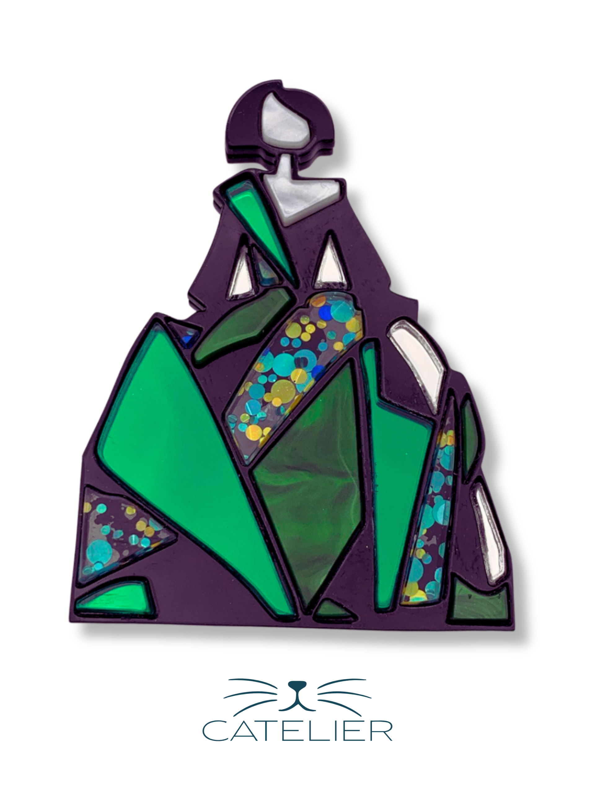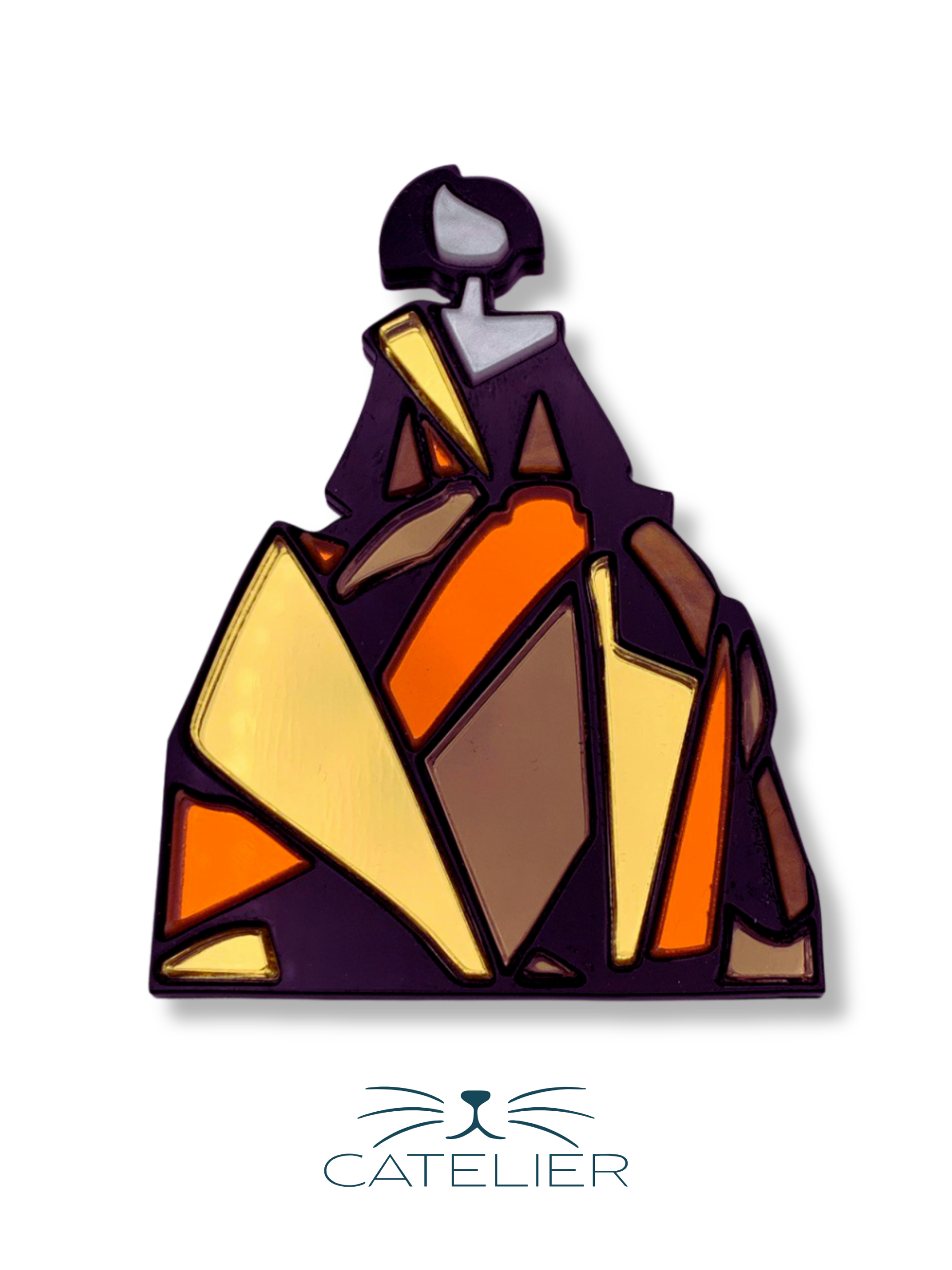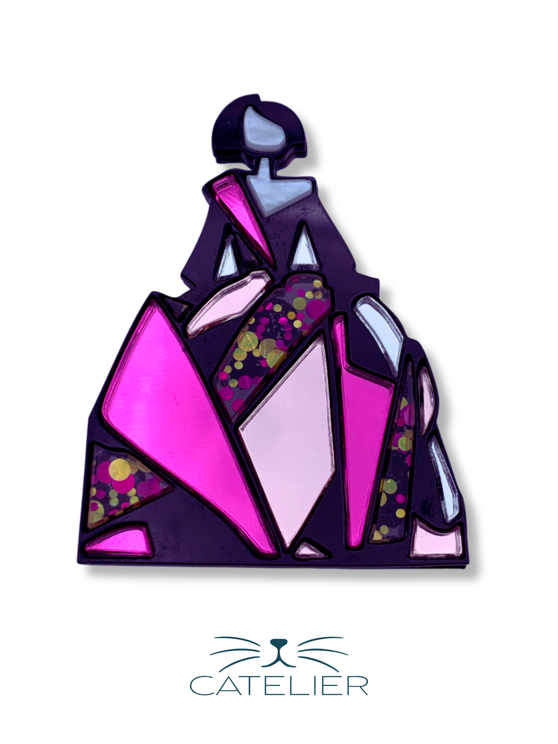 El Broche/Colgante Meninas es una pieza que fusiona arte clásico y diseño contemporáneo. Inspirado en la silueta de Las Meninas de Velázquez, este accesorio único puede llevarse tanto como broche decorativo en chaquetas, camisas o bolsos, como colgante llamativo con cadena.