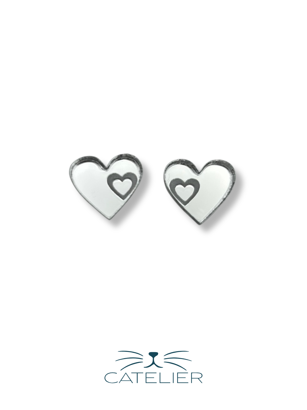 Un mini pendiente de corazón plateado espejo, con grabado de un corazón interior y perno. Delicado, brillante y perfecto para peques.