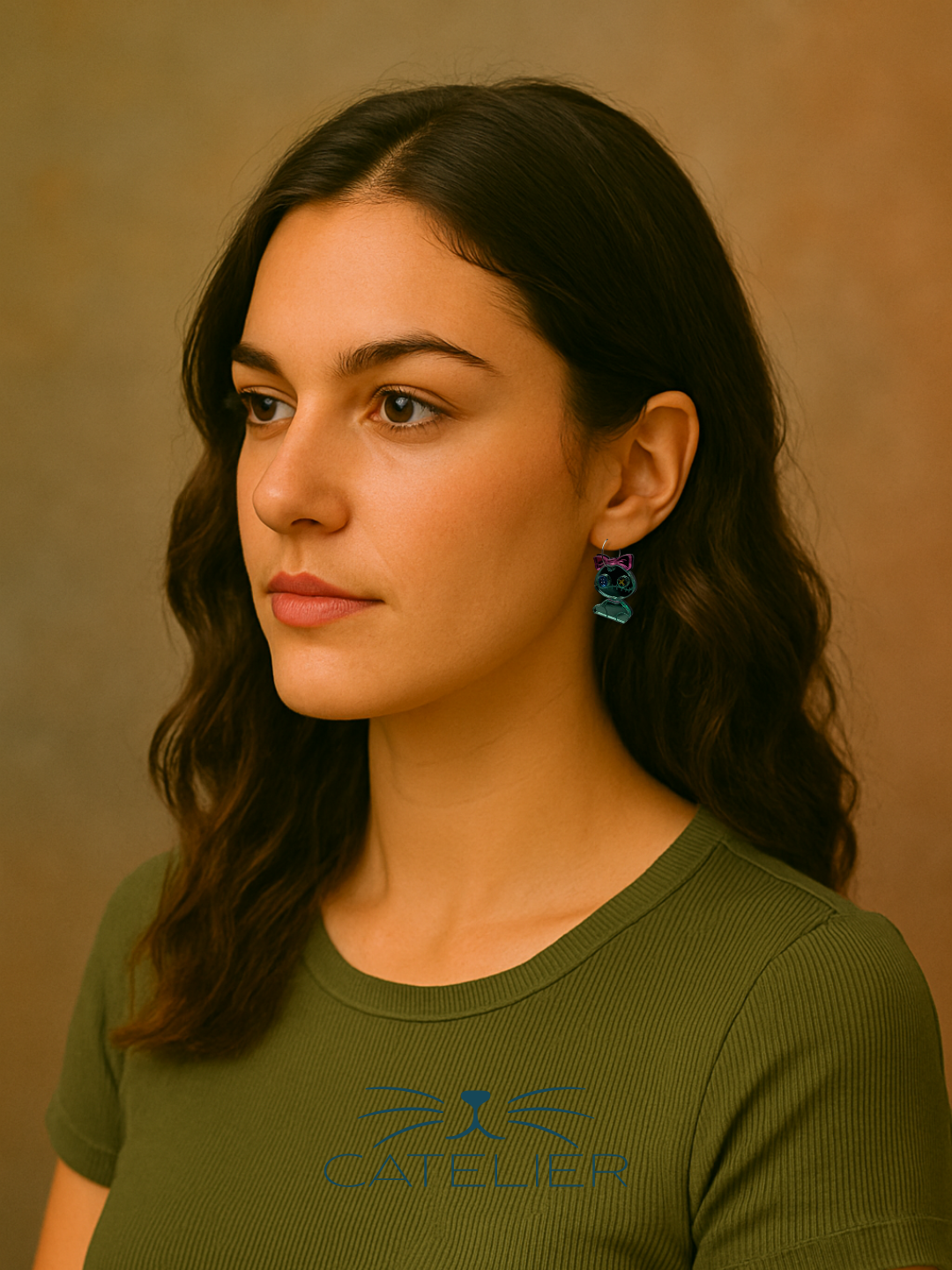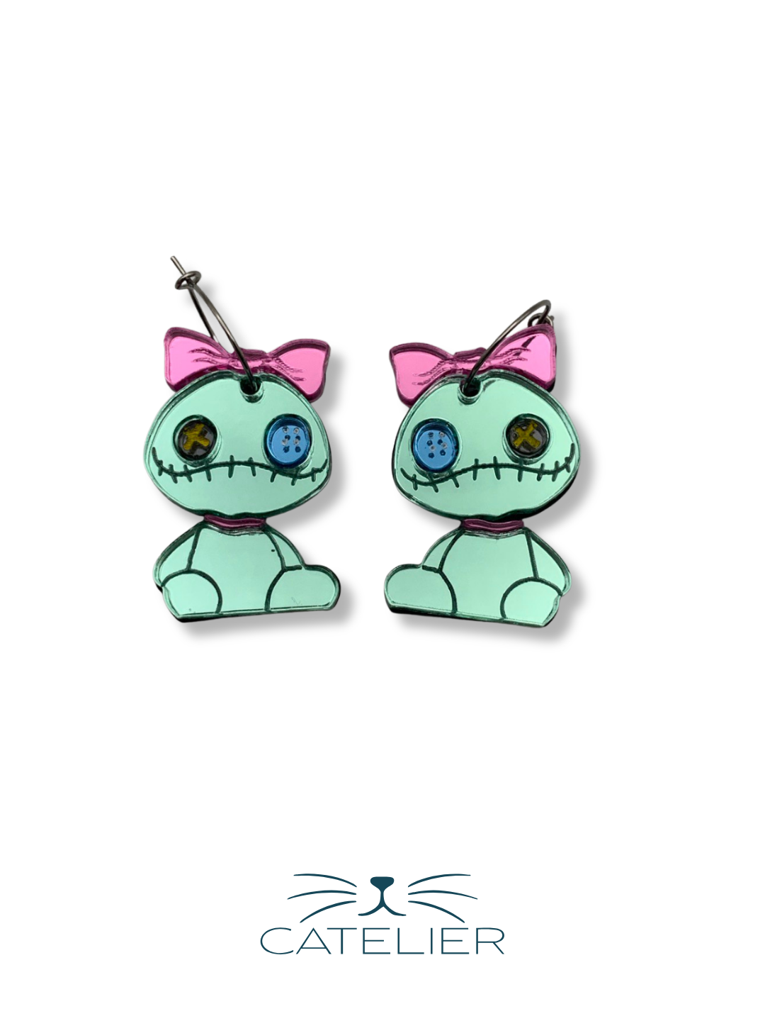 Los pendientes Muñeca Vudú mezclan lo adorable con lo misterioso en un diseño lleno de personalidad. Están elaborados en metacrilato espejo verde menta y rosa, con detalles en colores vivos que simulan botones cosidos y costuras, creando un efecto único y muy Halloween. El gran lazo rosa en la parte superior aporta un contraste divertido y encantador.