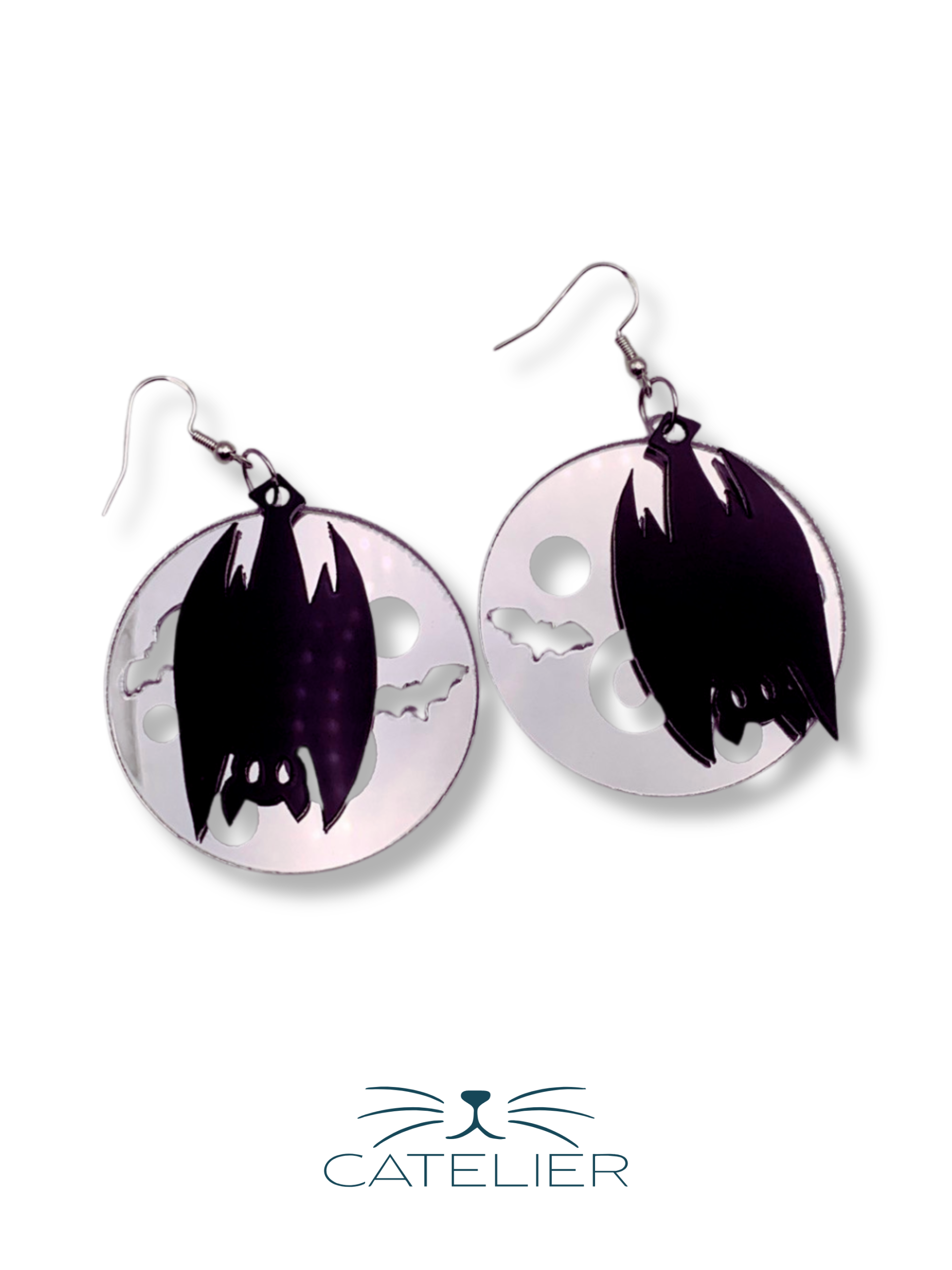 Pendientes con luna en metacrilato espejo plateado y murciélago negro colgado boca abajo. El equilibrio perfecto entre lo siniestro y lo elegante.