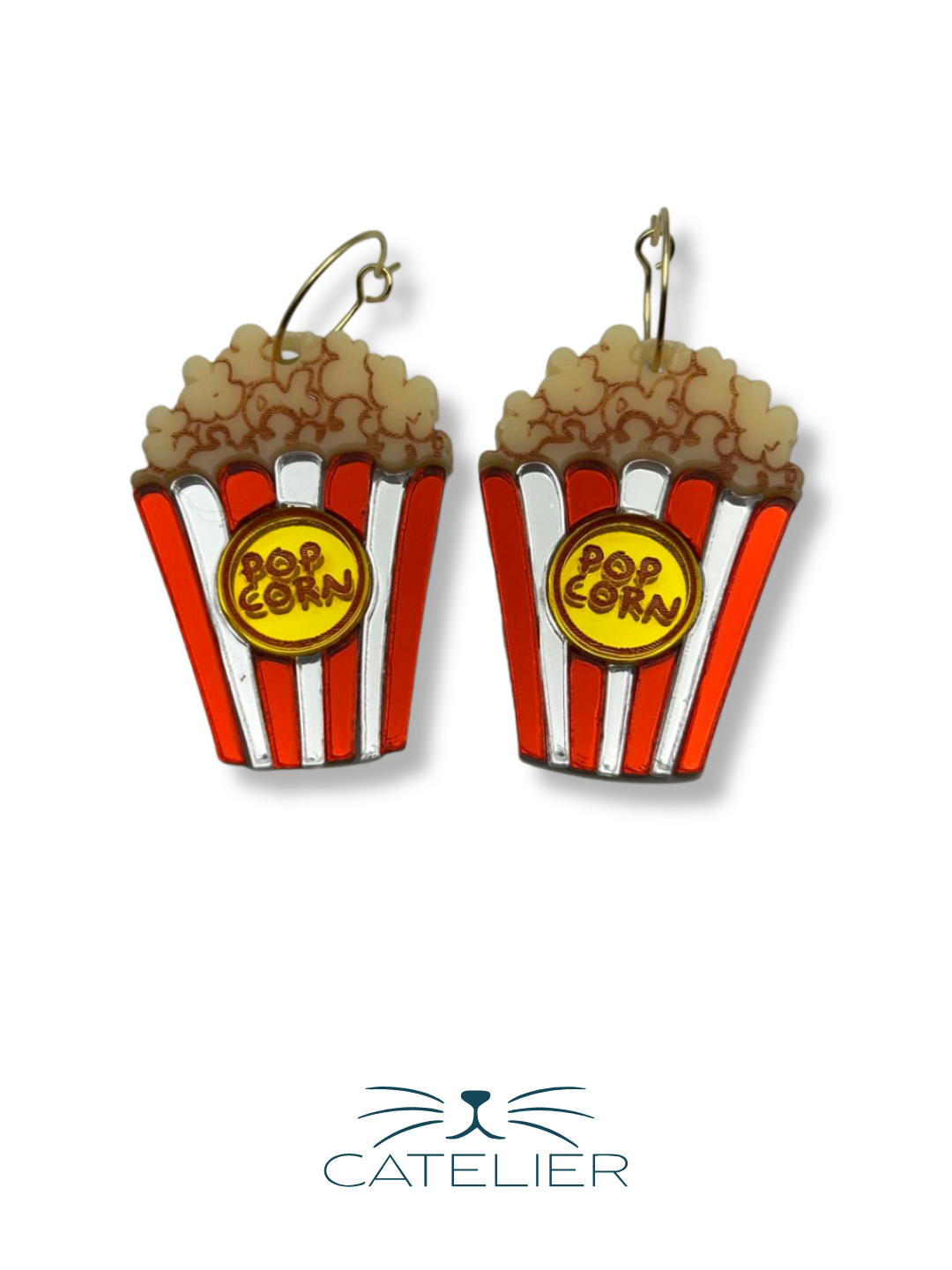 Los pendientes Palomitas Movie son un guiño divertido al cine y a los pequeños placeres. La caja de palomitas está realizada en metacrilato de dos colores, creando contraste y personalidad, mientras que las palomitas están elaboradas en metacrilato grabado, con detalles que aportan textura y realismo al diseño.