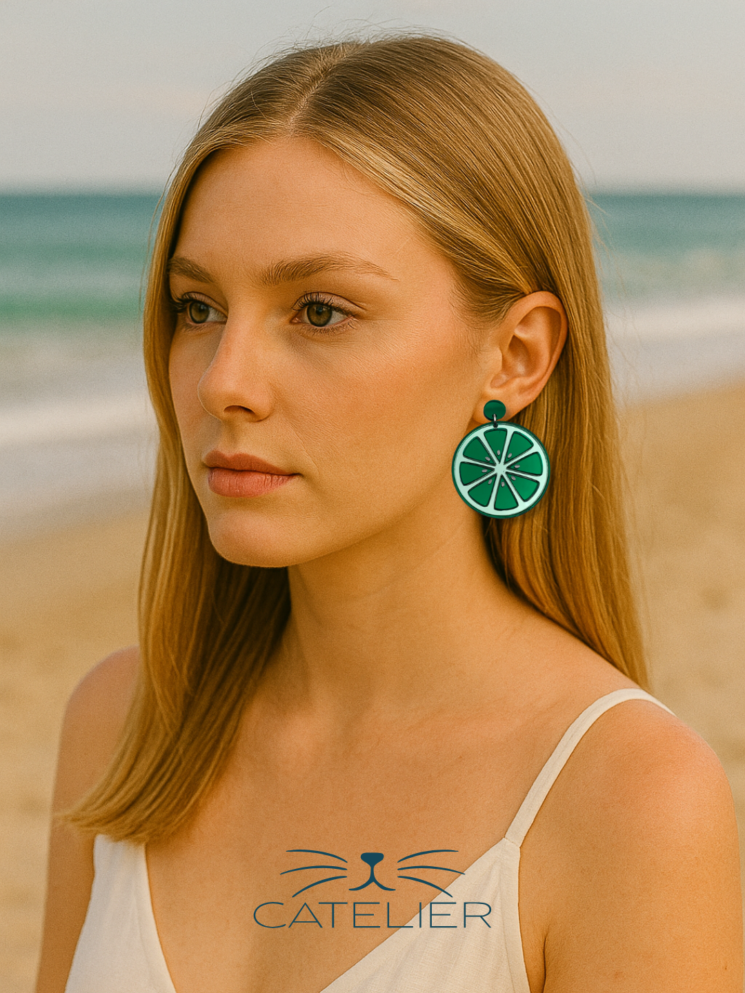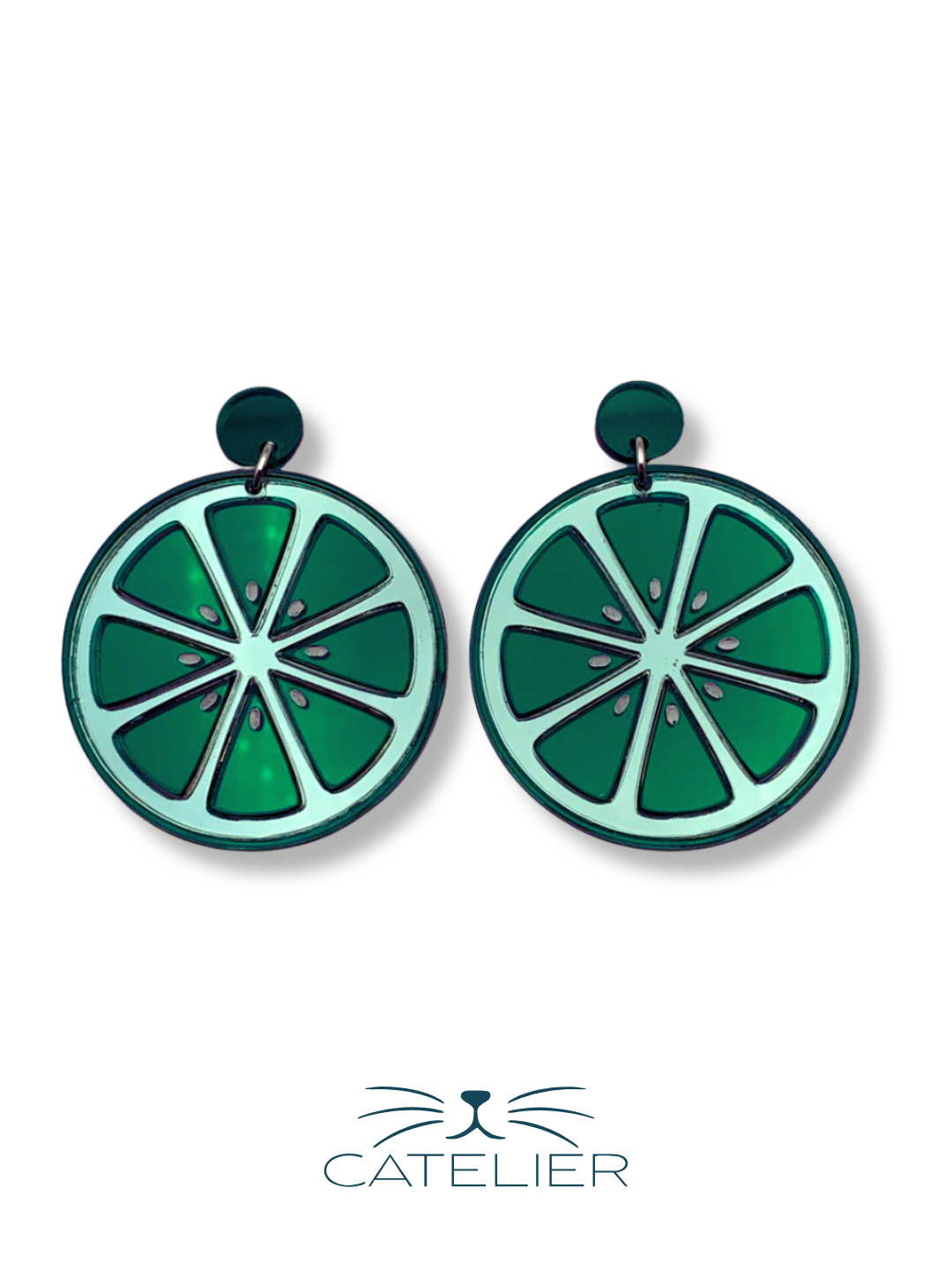 Pendientes en forma de rodaja de lima en metacrilato espejo verde y blanco. Un diseño artesanal, vibrante y muy refrescante.