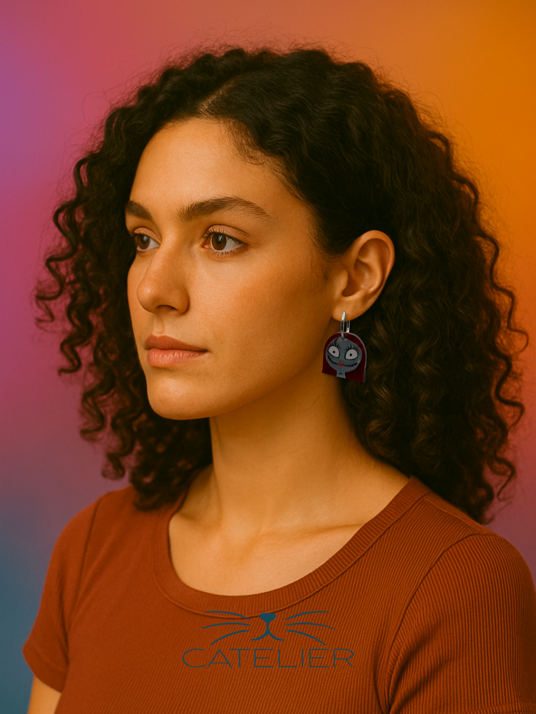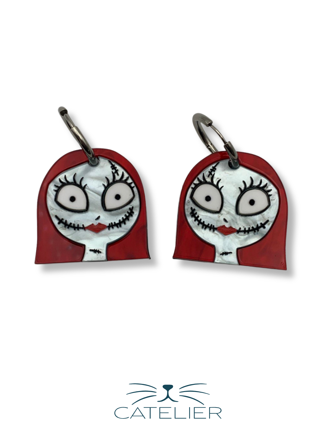 Los pendientes Sally están inspirados en un personaje mítico que simboliza ternura y oscuridad a la vez. Confeccionados en metacrilato nacarado blanco para el rostro, detalles negros que remarcan las cicatrices y una melena roja que aporta contraste y personalidad, capturan a la perfección la esencia de esta figura tan querida.