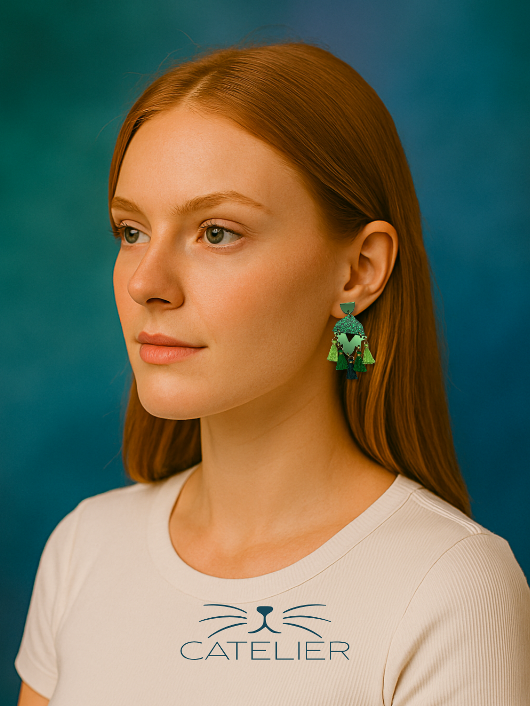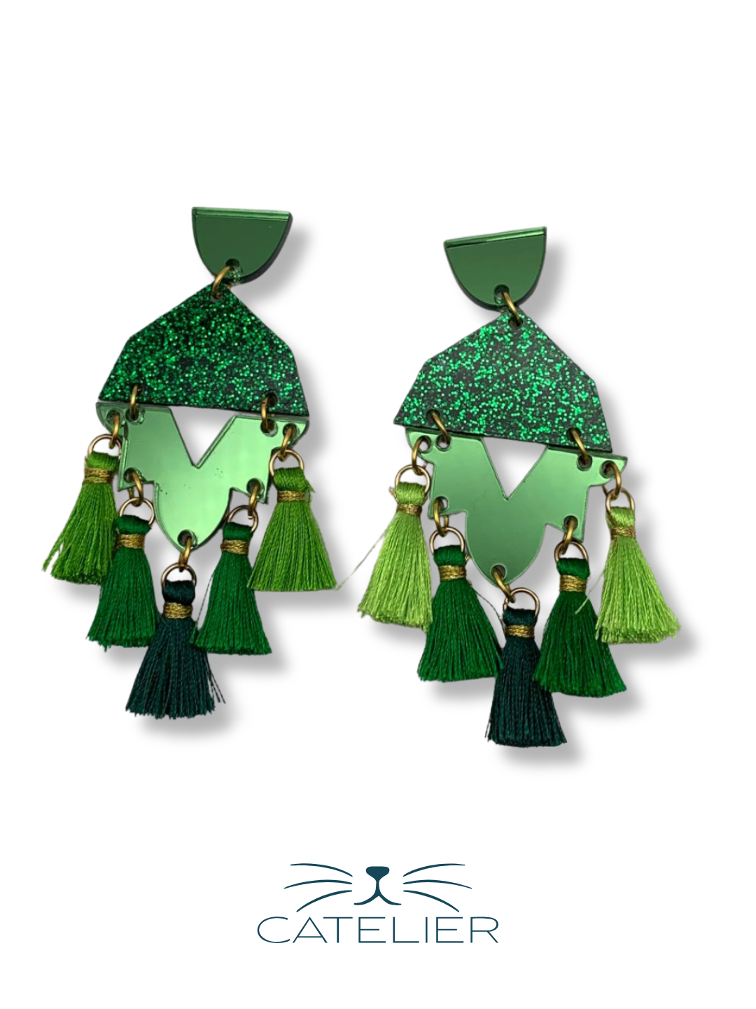 Los pendientes Selva son un estallido de frescura y color. Están elaborados en metacrilato espejo verde combinado con piezas en verde glitter, que aportan brillo y fantasía. El diseño se completa con varias borlas en diferentes tonos de verde, que generan contraste, movimiento y un aire natural inspirado en la jungla.