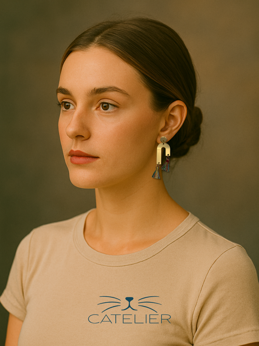 Los pendientes Sol de Oro combinan la elegancia del metacrilato espejo dorado con la frescura de unas borlas multicolor que aportan dinamismo y alegría. Su diseño geométrico en forma de arco invertido refleja modernidad y sofisticación, mientras que los tonos vivos de las borlas evocan energía y vitalidad.