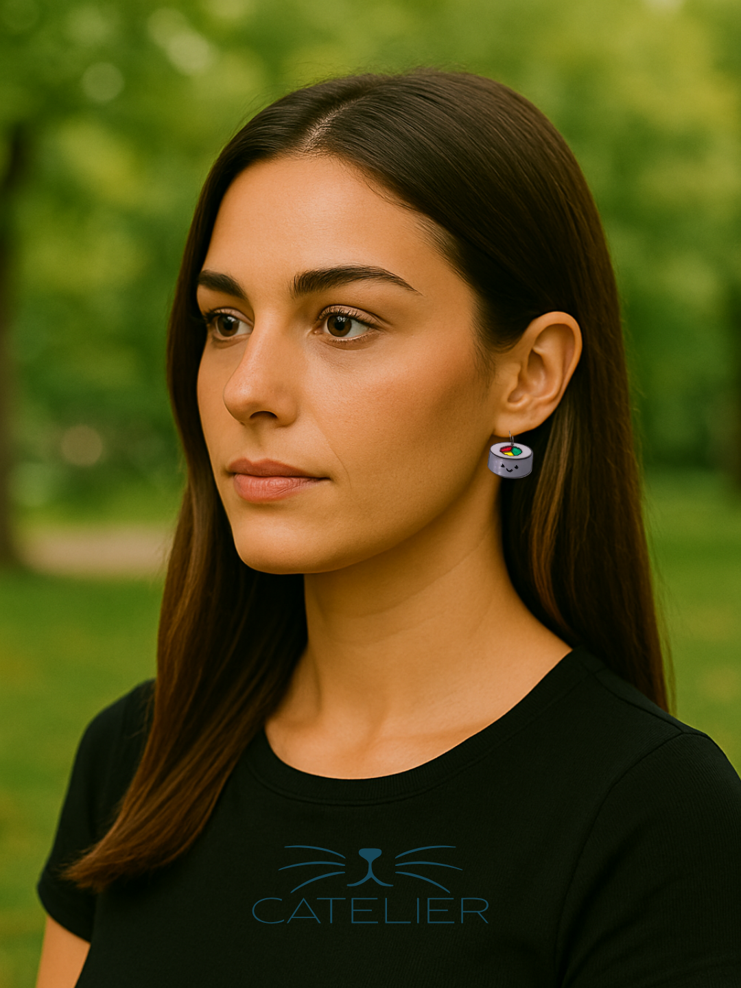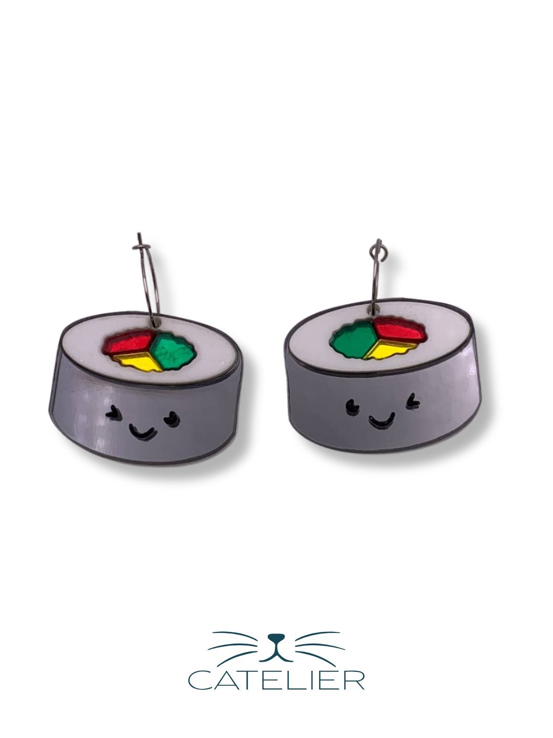 Los pendientes Sushi Roll son irresistibles para amantes de la comida japonesa y los accesorios originales. Están elaborados en metacrilato espejo para el alga y los ingredientes del interior (en tonos verde, rojo y amarillo), mientras que el arroz se representa en blanco liso para dar contraste. El detalle de la carita kawaii sonriente convierte a este diseño en un accesorio tierno, alegre y muy divertido.