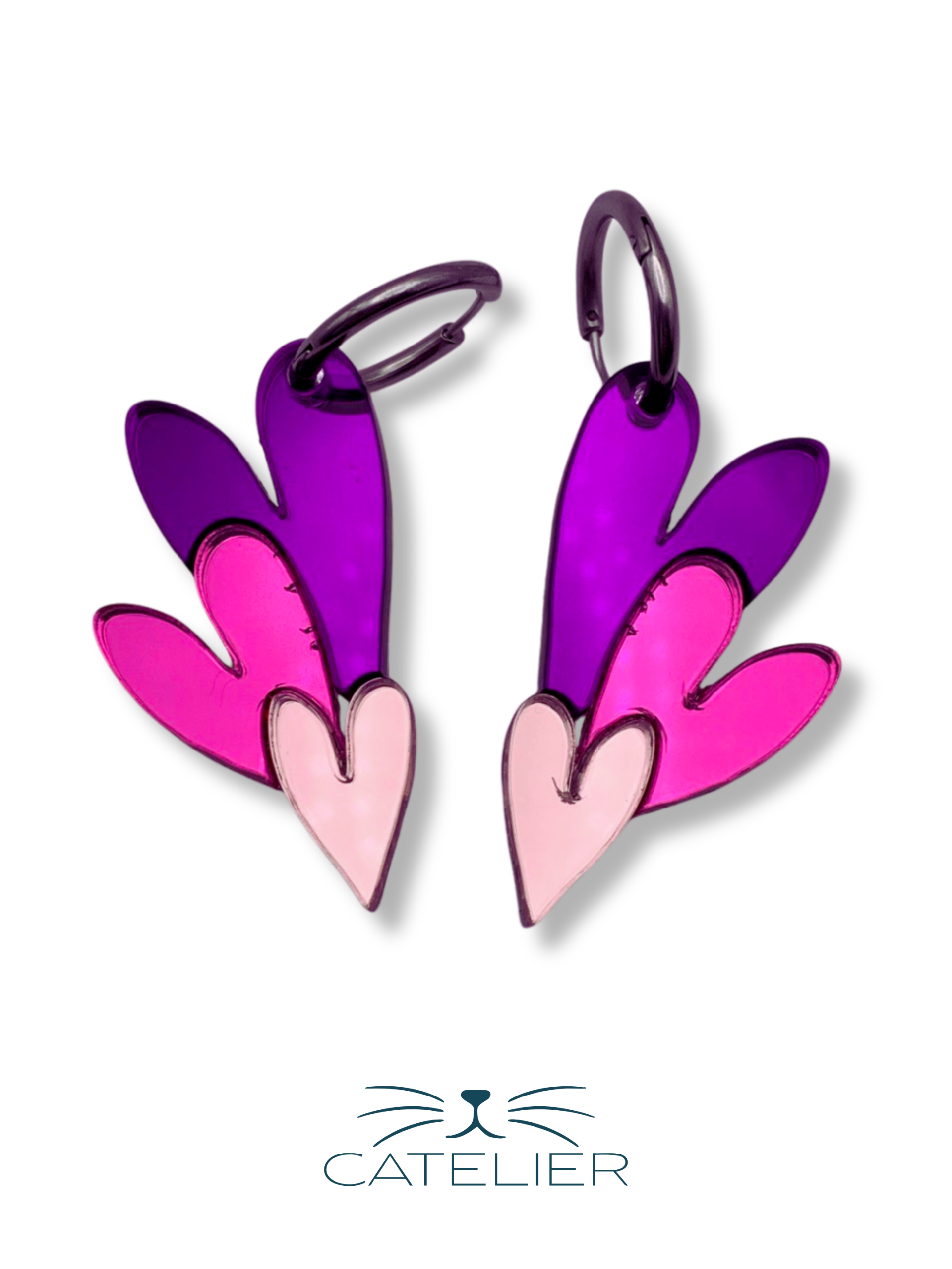 Pendientes con tres corazones superpuestos en metacrilato espejo de distintos colores. Diseño romántico, brillante y hecho a mano en España.